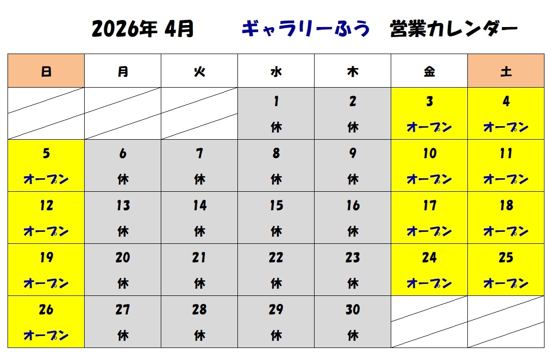 ギャラリーふうは、通常通り毎週金土日に営業します。